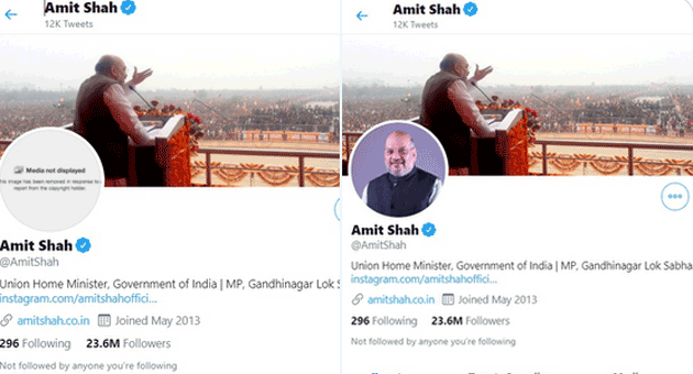 अमित शाह के वेरीफाइड ट्विटर अकांउंट के डीपी पर क्लिक करने पर वह तस्वीर नहीं दिख रही थी। डिस्पेल पिक्चर ( प्रोफाइल फोटो) की जगह एक ब्लैंक पेज आ रहा था और उस पर एक संदेश भी लिखा था, जिसमें कॉपीराइट मामले के तहत डीपी फोटो को हटाने की बात कही गई थी।