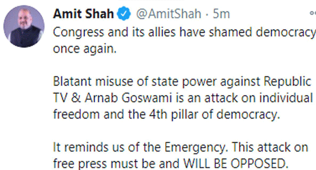 श्री शाह ने ट्वीट कर आरोप लगाया, ‘‘कांग्रेस और उसके सहयोगियों ने एक बार फिर लोकतंत्र को कलंकित किया है। रिपब्लिक टीवी और अर्नब गोस्वामी के खिलाफ सत्ता का खुल्लमखुल्ला दुरुपयोग व्यक्तिगत आजादी और लोकतंत्र के खैथे खम्भे पर पर हमला है।’’ उन्होंने आरोप लगाया, ‘‘यह घटना आपातकाल की याद दिलाता है। प्रेस की आजादी पर इस हमले का विरोध जरूर होना चाहिए और विरोध किया जाएगा।