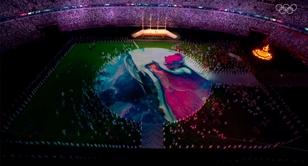 जापान का ध्वज 68,000 दर्शकों की क्षमता वाले नेशनल स्टेडियम में फहराया गया जिसमें कोविड-19 महामारी के कारण दर्शकों की कमी थी। इसके बाद दुनिया भर के खिलाड़ियों, गणमान्य व्यक्तियों और अधिकारियों के सामने समारोह शुरू हुआ।